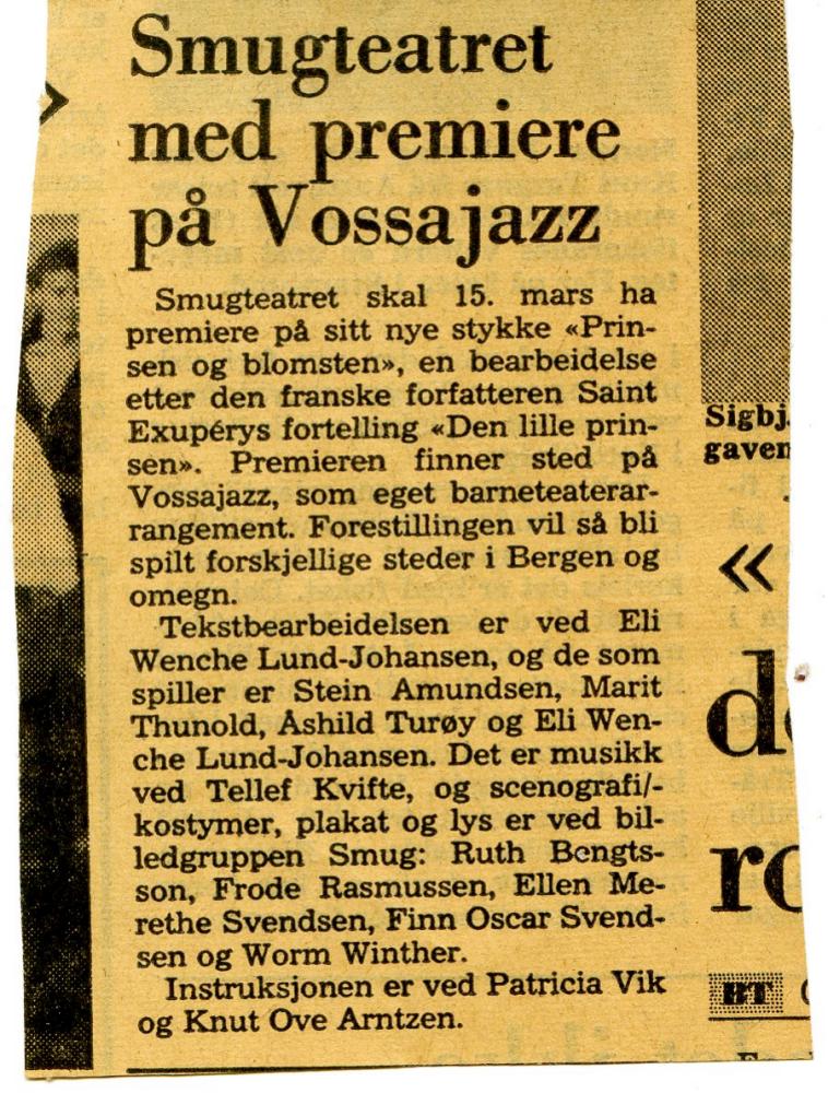 Smugteatret med premiere på Vossajazz (literally: Smugteatret with premiere during Vozzajazz). Preview article about Smugteatret's production The Little Prince (1980). The article was published in Bergenstidende during March 1980.