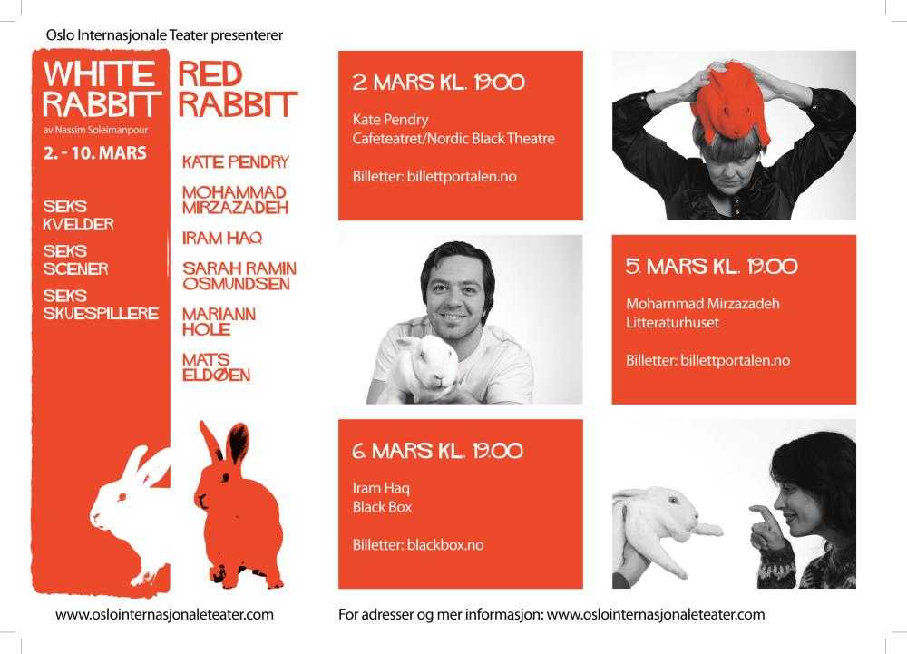 Flygeblad fra Oslo Internasjonale Teater produksjon White Rabbit, Red Rabbit (2012)