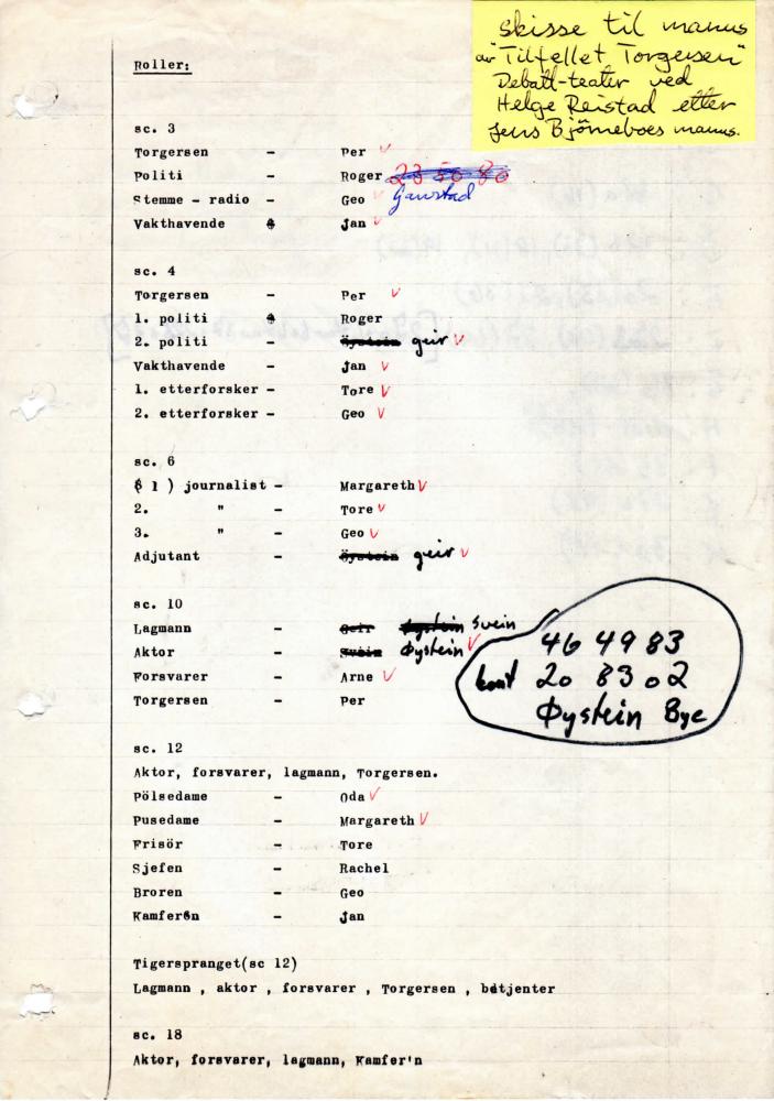 Arbeidsmanus fra Musidra Teaters produksjon "Tilfellet Torgersen" (1973)