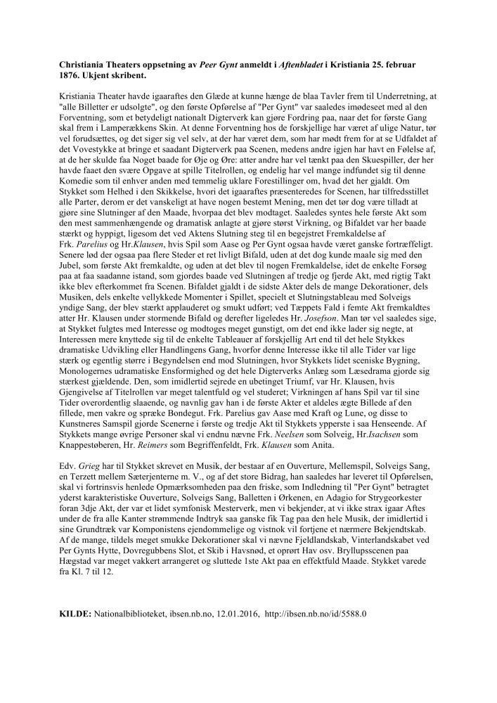 Review of Henrik Ibsen's Peer Gynt, Christiania Theatre 1876. The review was published in Aftenbladet February 26 1876.