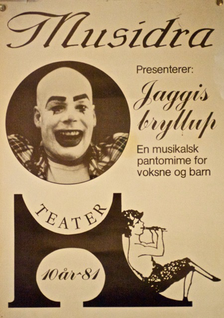 Plakat fra Musidra Teaters produksjon Jaggis bryllup. Babylogos i parken (1981)
