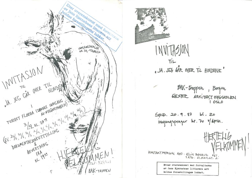 Invitasjon, 20.09.87, til Baktruppens produksjon "Ja. Jeg går over til hundene" (1987)