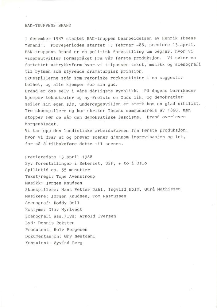 Informasjonsark om Baktruppens produksjon "Alt" (1988)