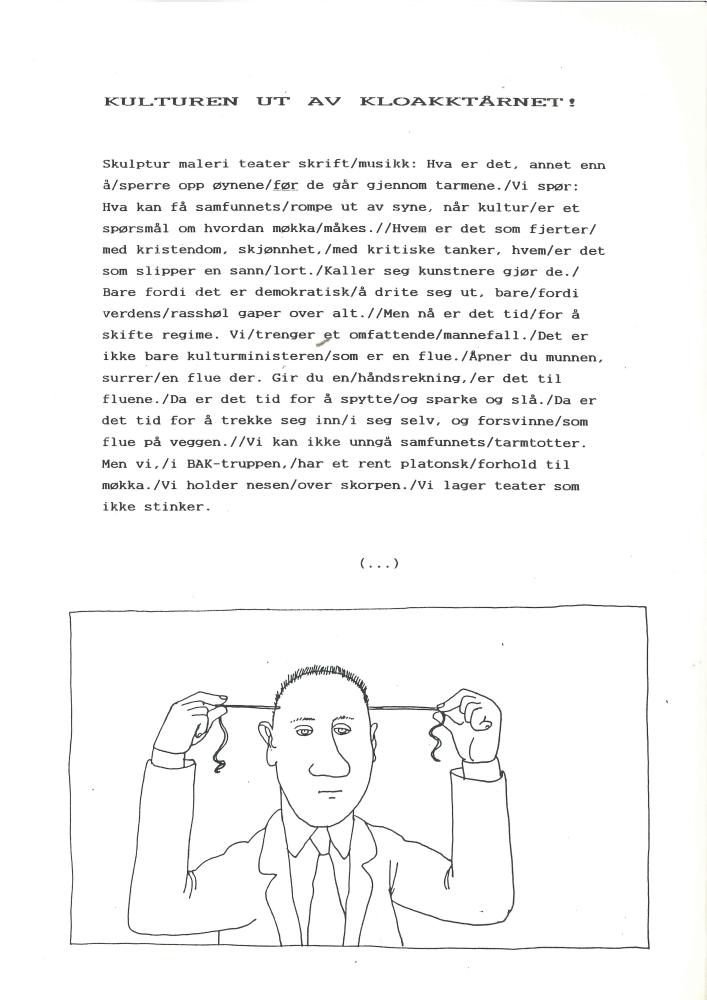 Tekstmateriale om Baktruppens aksjon "Kulturen ut av kloakktårnet/Kunsten å møte veggen" (1988)