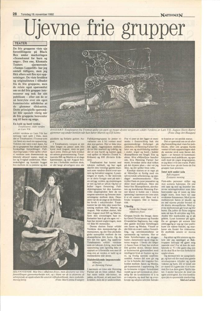 Omtale av IdaLou Larsen,18.11.92, i Nationen om Baktruppen produksjon "Ekstasens Mening" (1992)