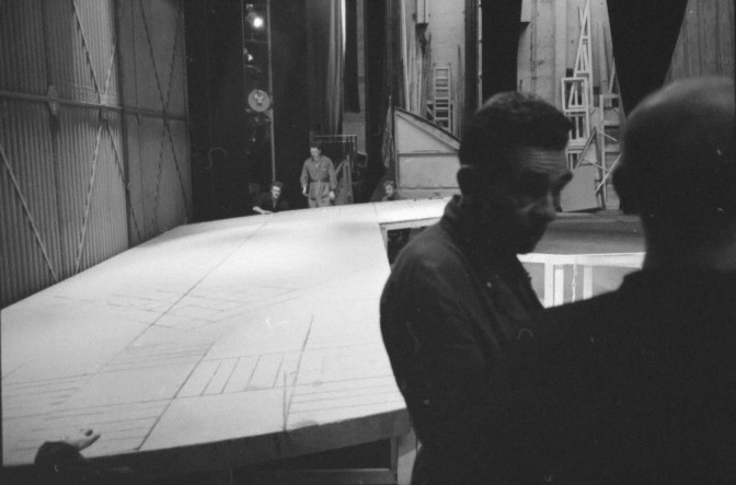 Fotografi av montering av scenen til Nationaltheatrets produksjon Bakkantinnene. (1973)