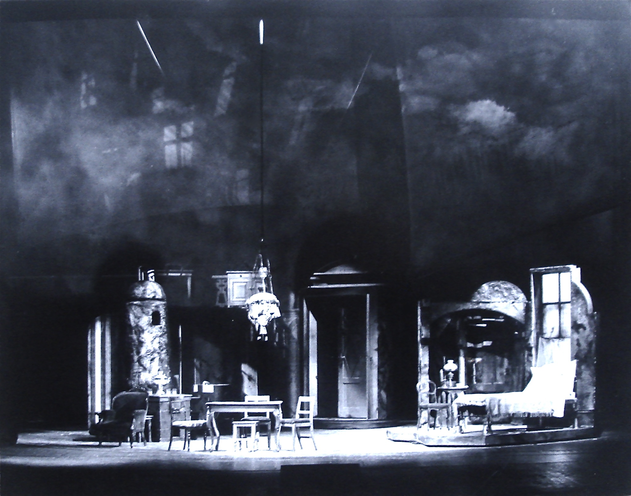 Fotografi av scenografien til Nationaltheatrets produksjon De besatte (1975)