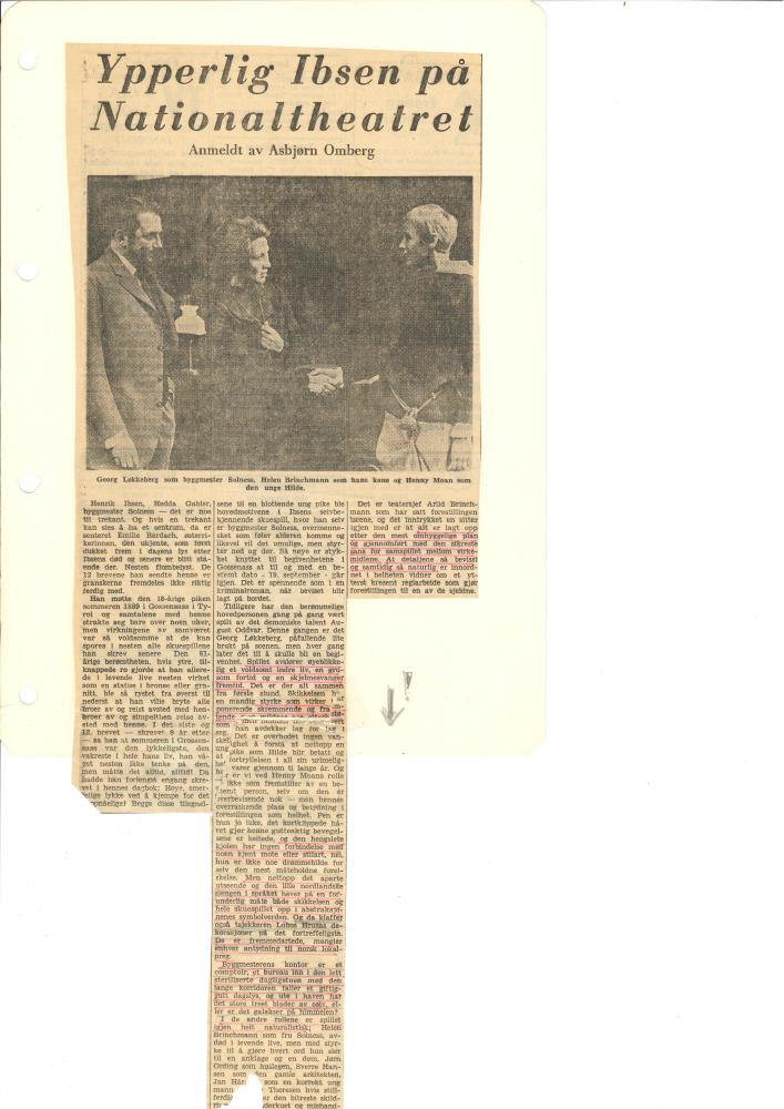 Ypperlig Ibsen på Nationaltheatret (literally: Excellent Ibsen at The National Theatre) . Review of The Master Builder, The National Theatre, 1969. The article was published in Morgenposten 1969.