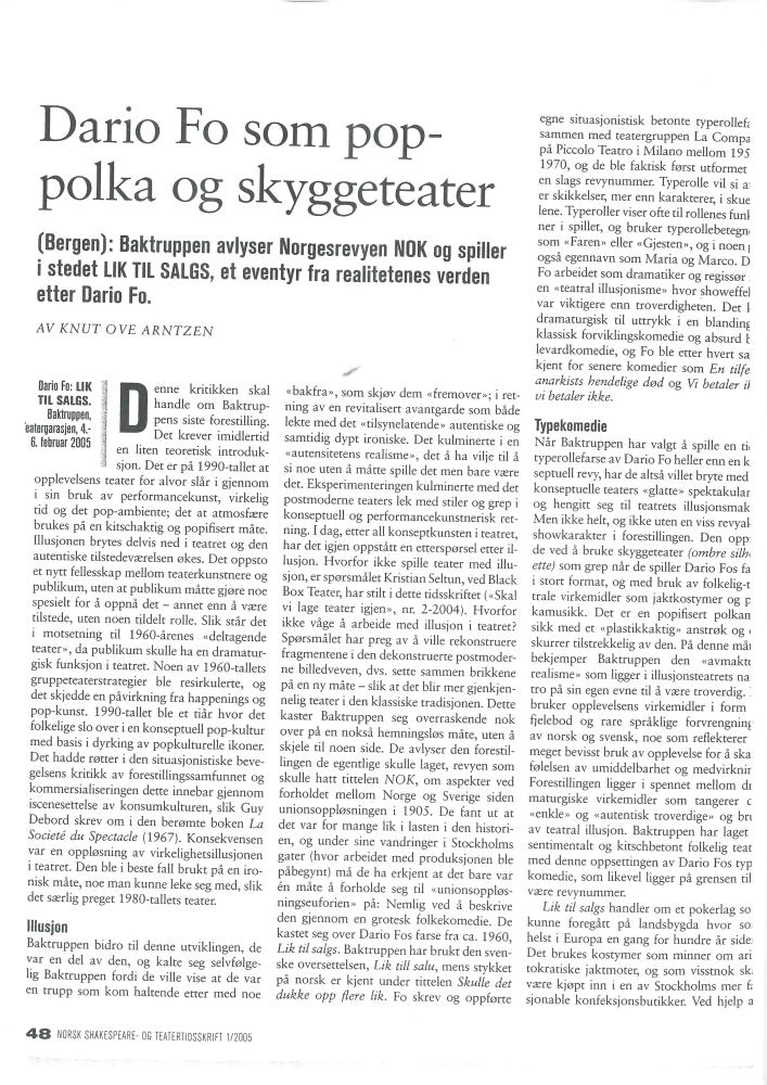 Anmeldelse av Knut Ove Arntzen, i Norsk Shakespeare - og teatertidsskrift av Baktruppen produksjon "Lik til salgs" (2005)