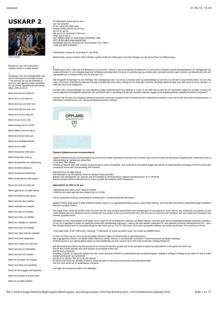 Informasjonsark fra Baktruppens produksjon Uskarp 2 (2007)