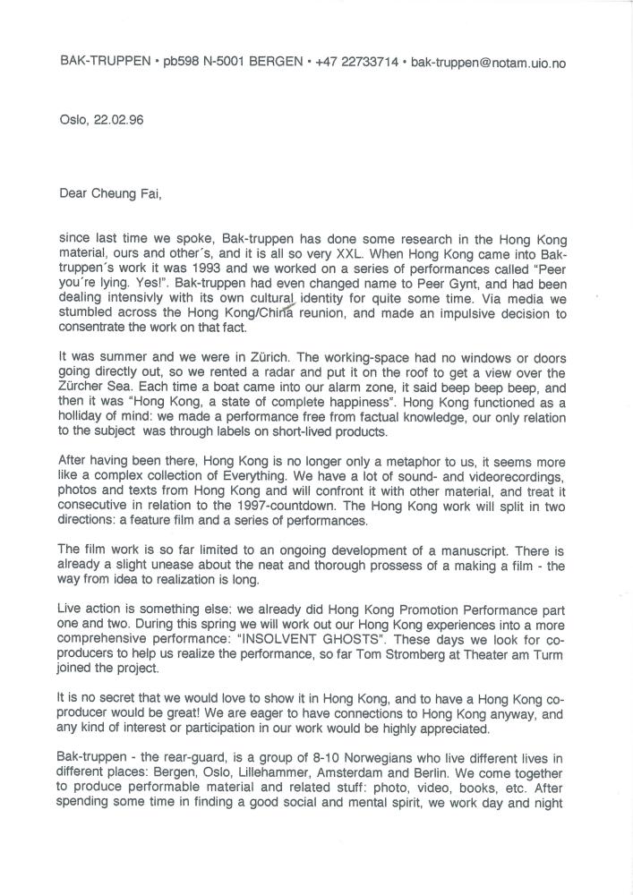 Brev til Cheung Fai fra Baktruppen, 22.02.96