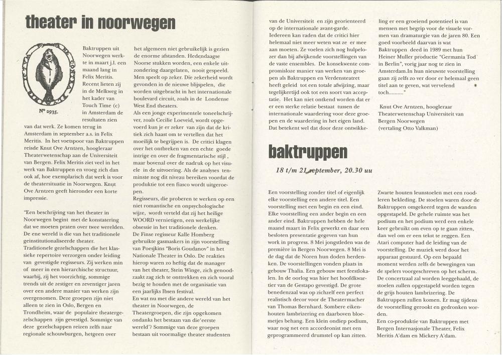 Artikkel i programkatalog av Knut Ove Arntzen i forbindelse med Baktruppen produksjon " " (1991)