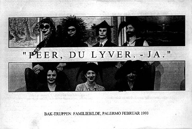 Flyer til Baktruppens produksjon, med publikumstegning, til "Peer, du lügst. Ja!/Peer, du lyver. Ja!/Peer, you're lying. Yes!" (1993) / Teatergarasjen 6.- 9.mai 1993