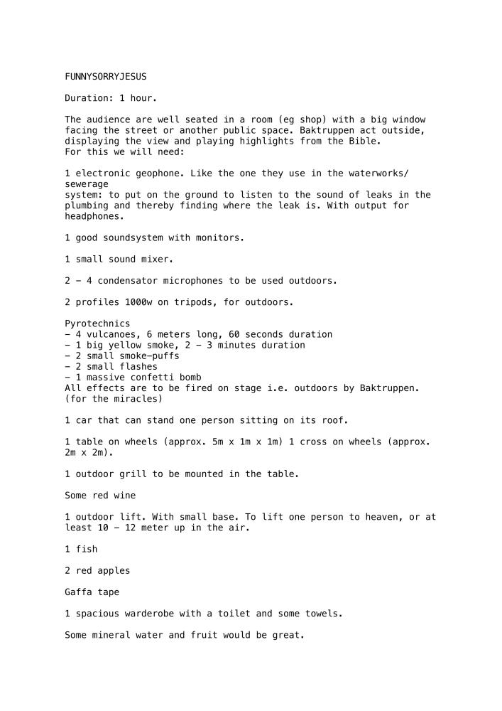 Teknisk raider for Baktruppens produksjon FUNNYSORRYJESUS (2003)