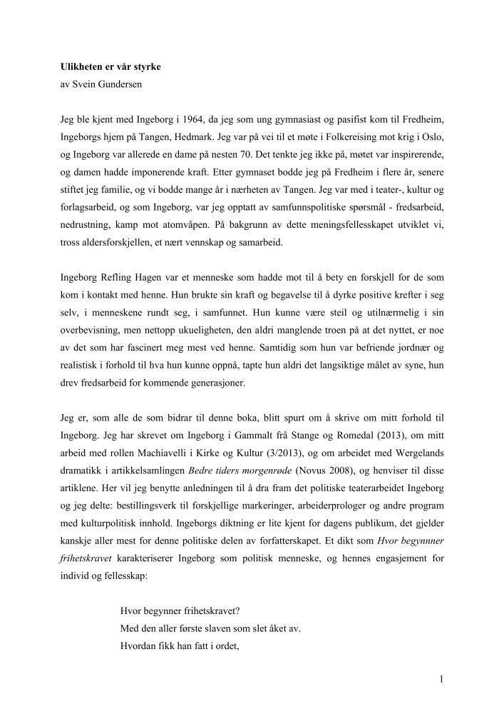 Artikkel av Svein Gundersen om Ingeborg Refling Hagen.