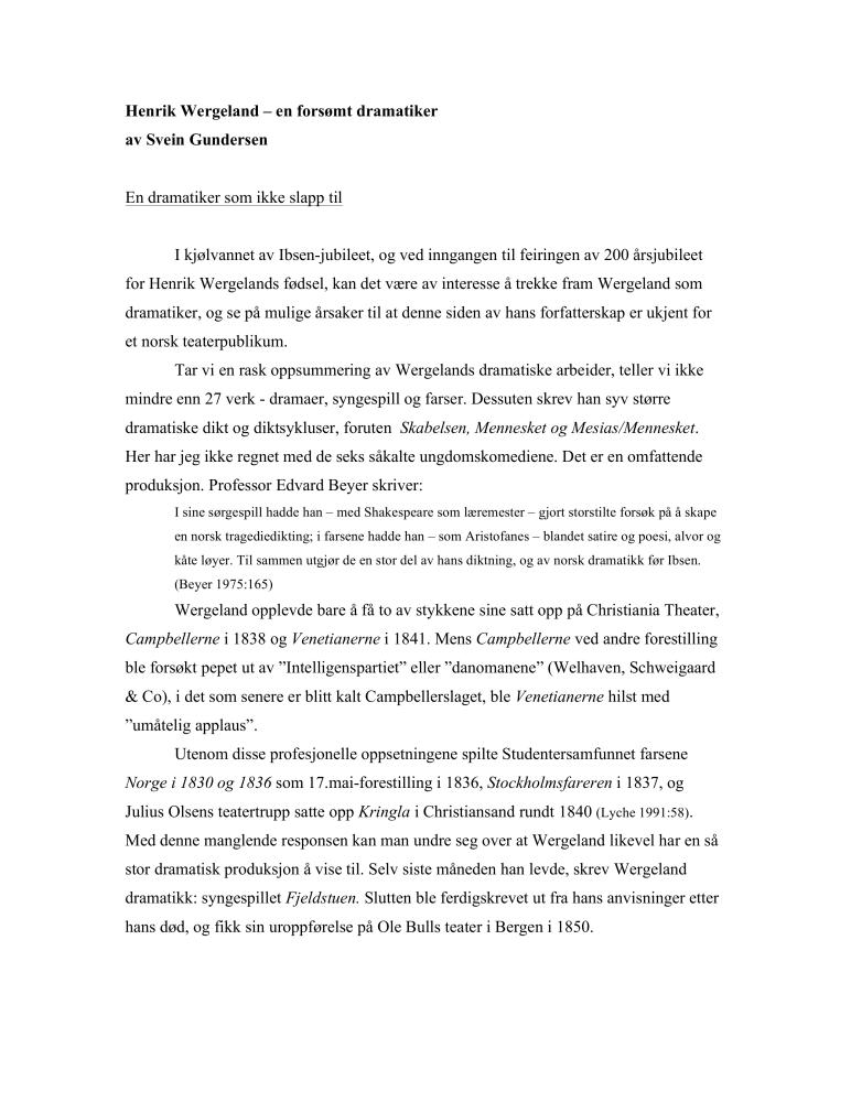 Artikkel av Svein Gundersen om Henrik Wergeland som dramatiker (2008)