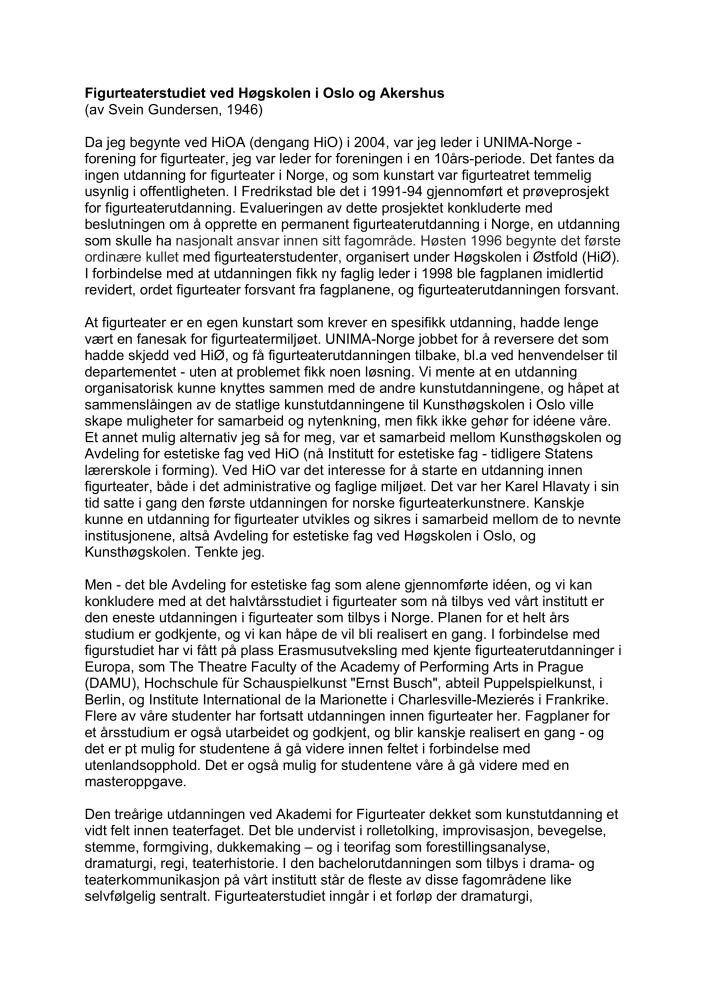 Artikkel av Svein Gundersen om figurteaterstudiet ved HiOA