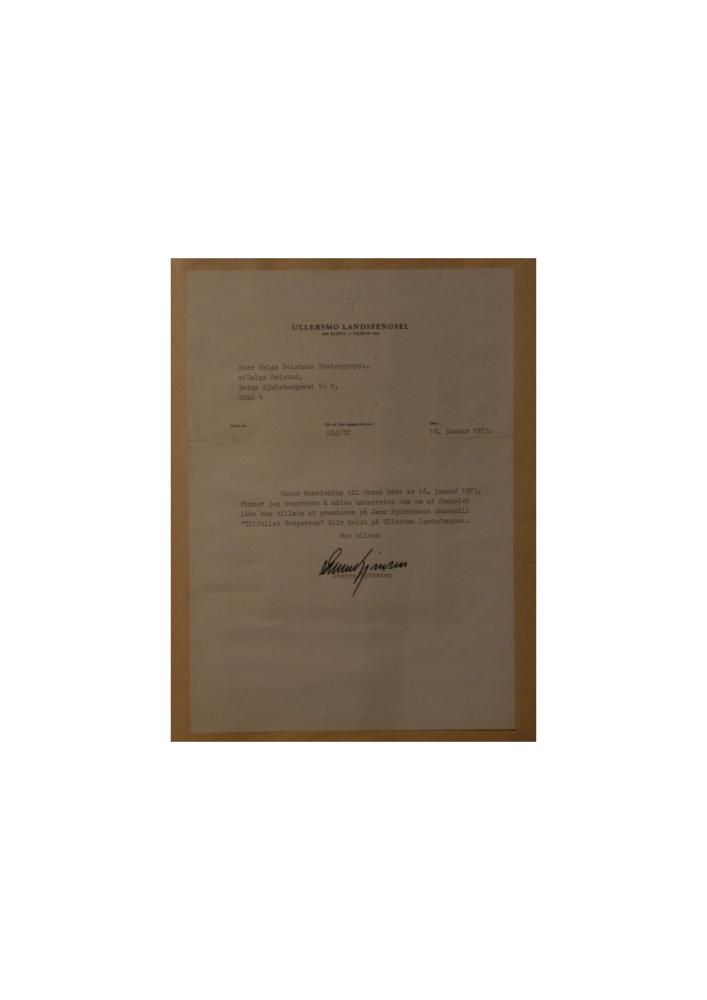Brev fra Ullersmo Landsfengsel angående Musidra Teaters produksjon Tilfellet Torgersen (1973)