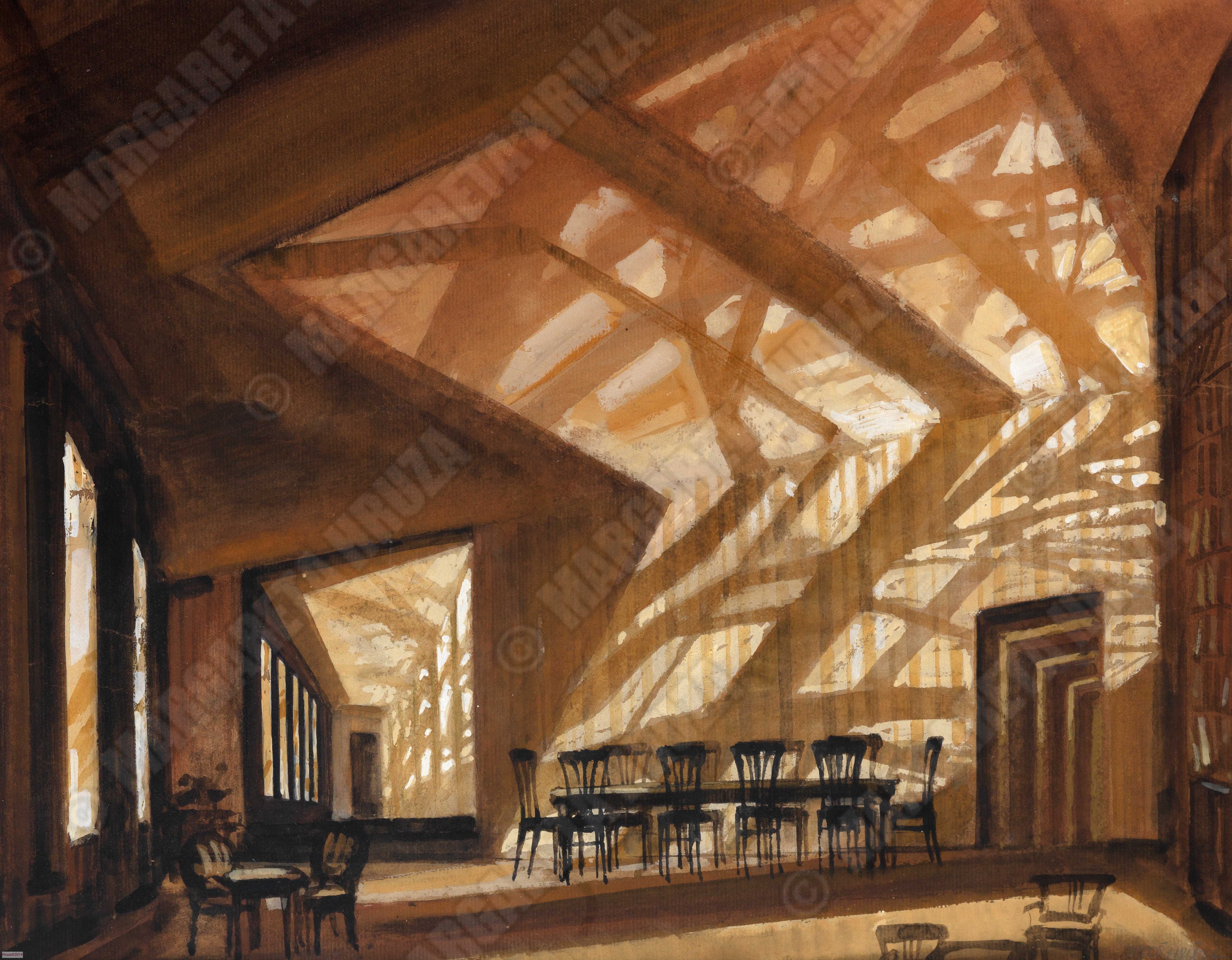 Maleri av Lubos Hruza til sceneløsning av akt 2 i Byggmester Solness, 1969, Nationaltheatret