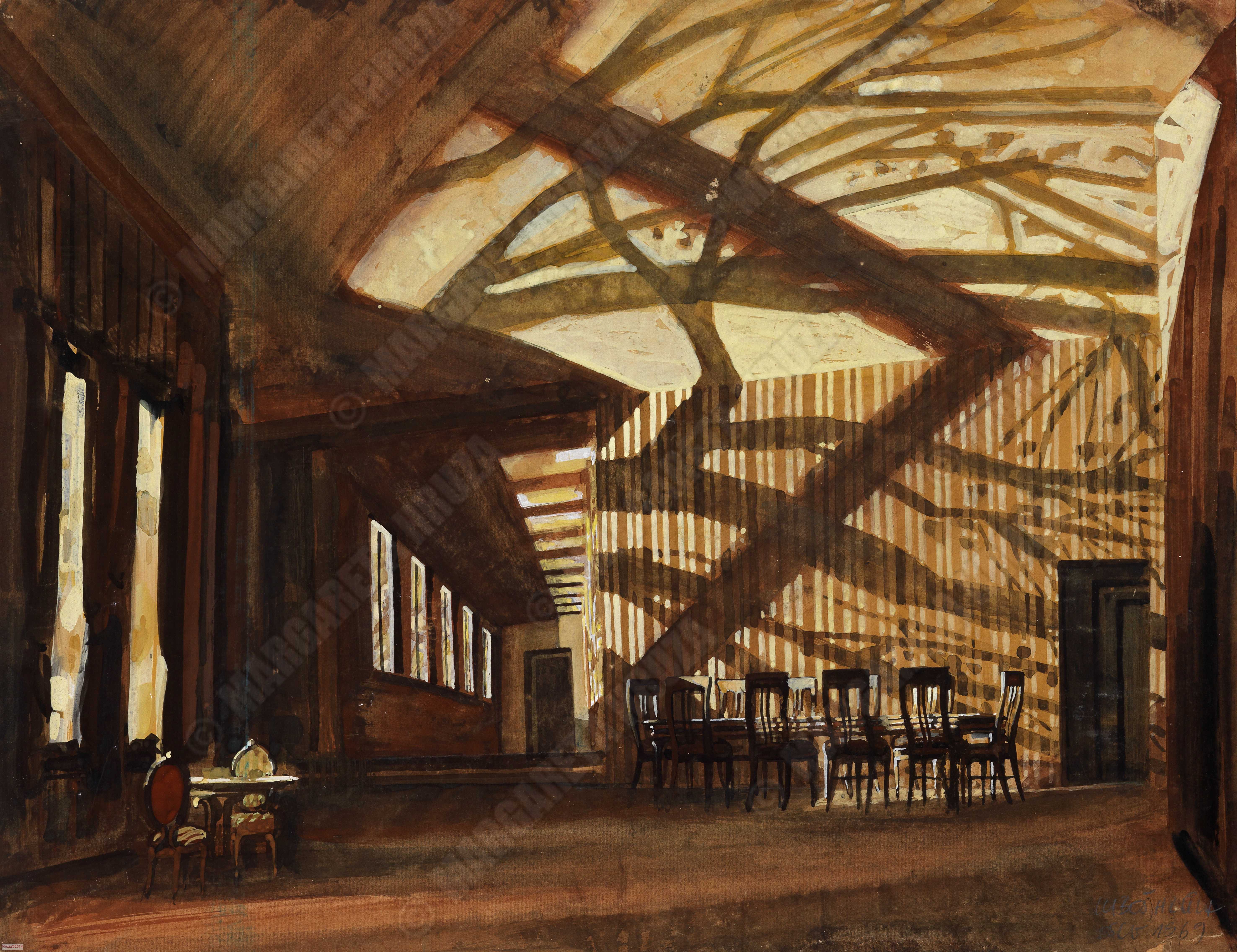 Maleri av Lubos Hruza til sceneløsning av akt 2 i Byggmester Solness, 1969, Nationaltheatret