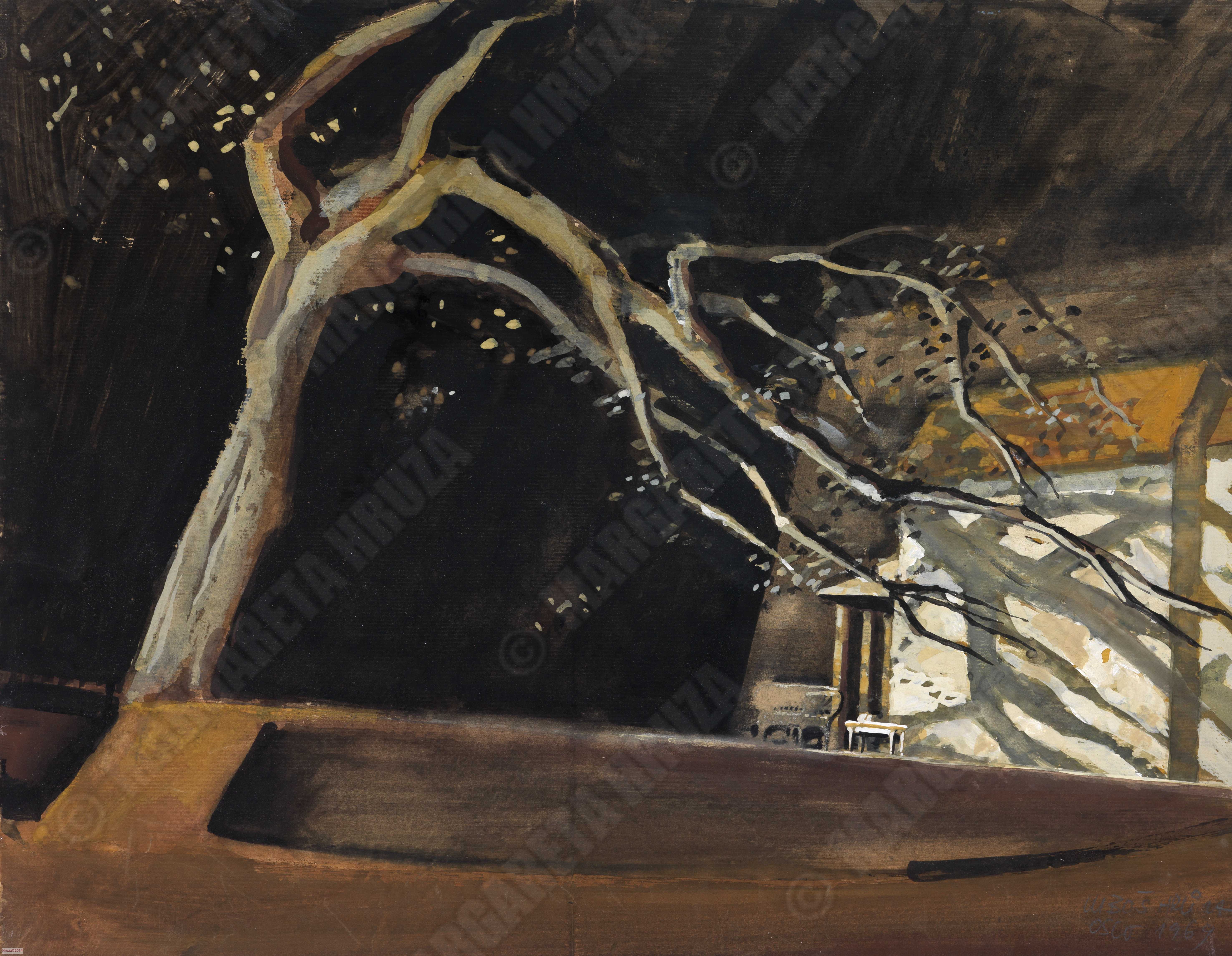 Maleri av Lubos Hruza til sceneløsning av akt 3 i Byggmester Solness, 1969, Nationaltheatret