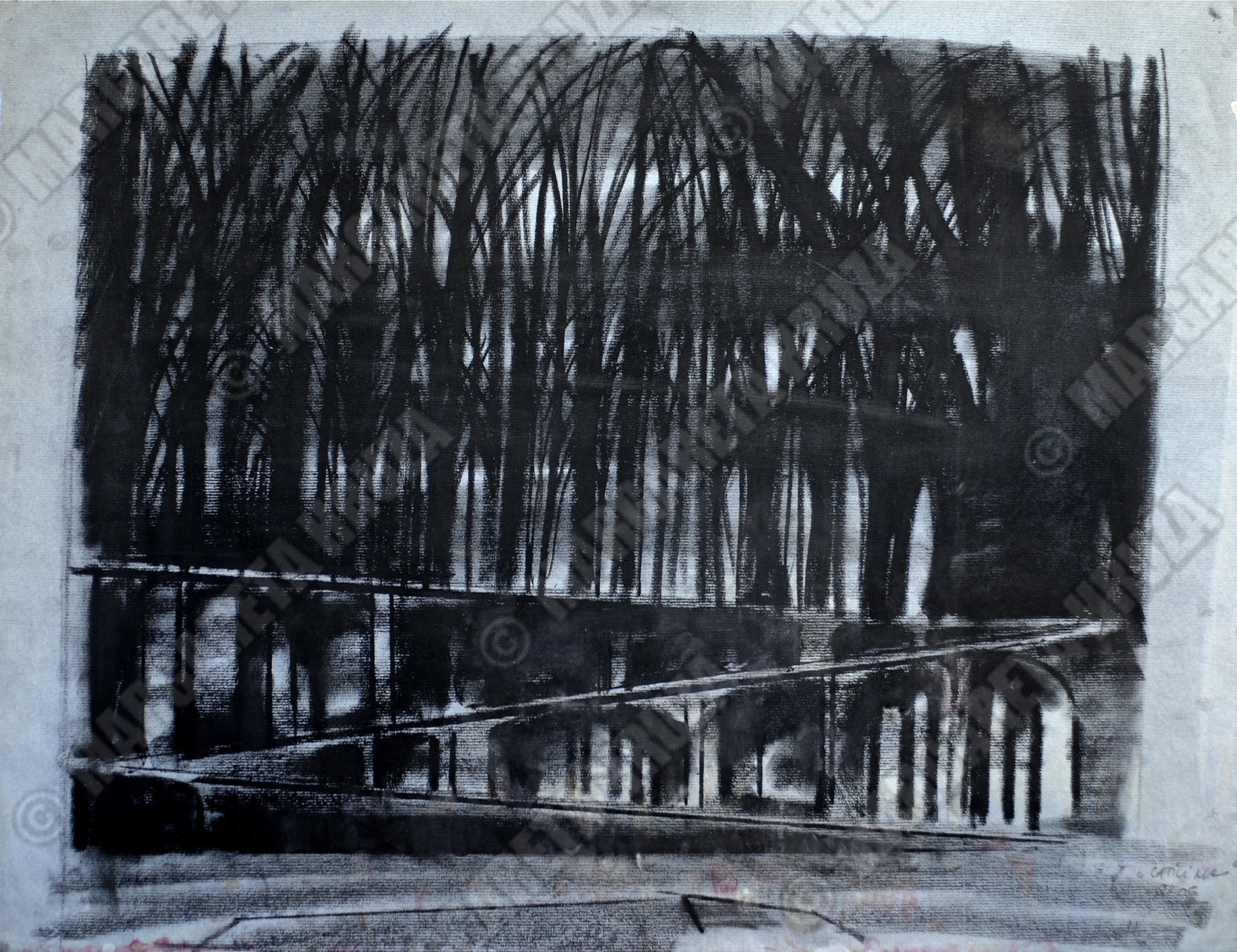 Tegning av Lubos Hruza av en ide til sceneløsningen til produksjonen Catilina, Nationaltheatret,1976