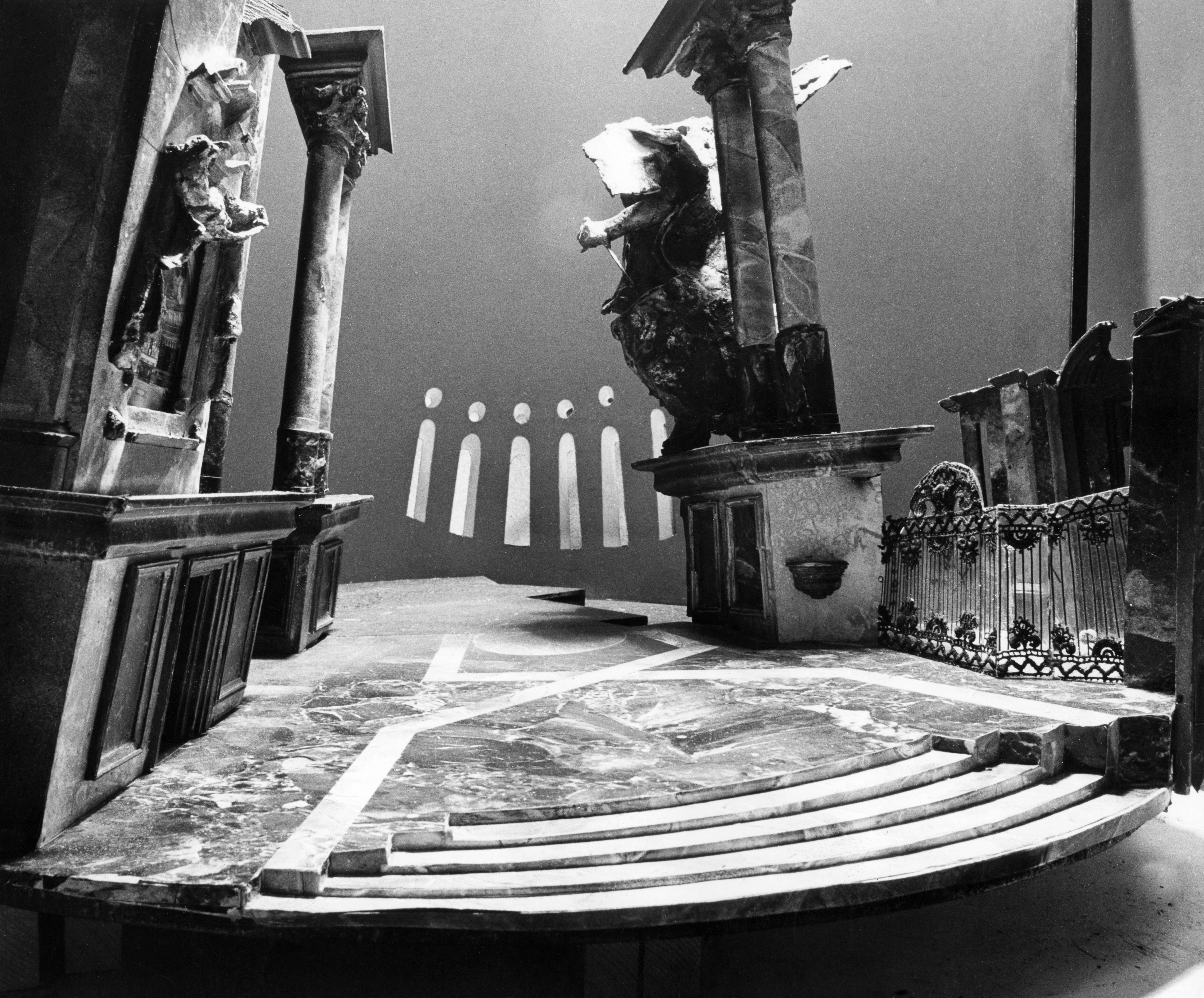 Fotografi av scenografimodellen til Lubos Hruza for første akt i operaproduksjonen Tosca, Den Norske Opera & Ballett (1976). Første akt tar sted i kirken Sant'Andrea della Valle i Roma.