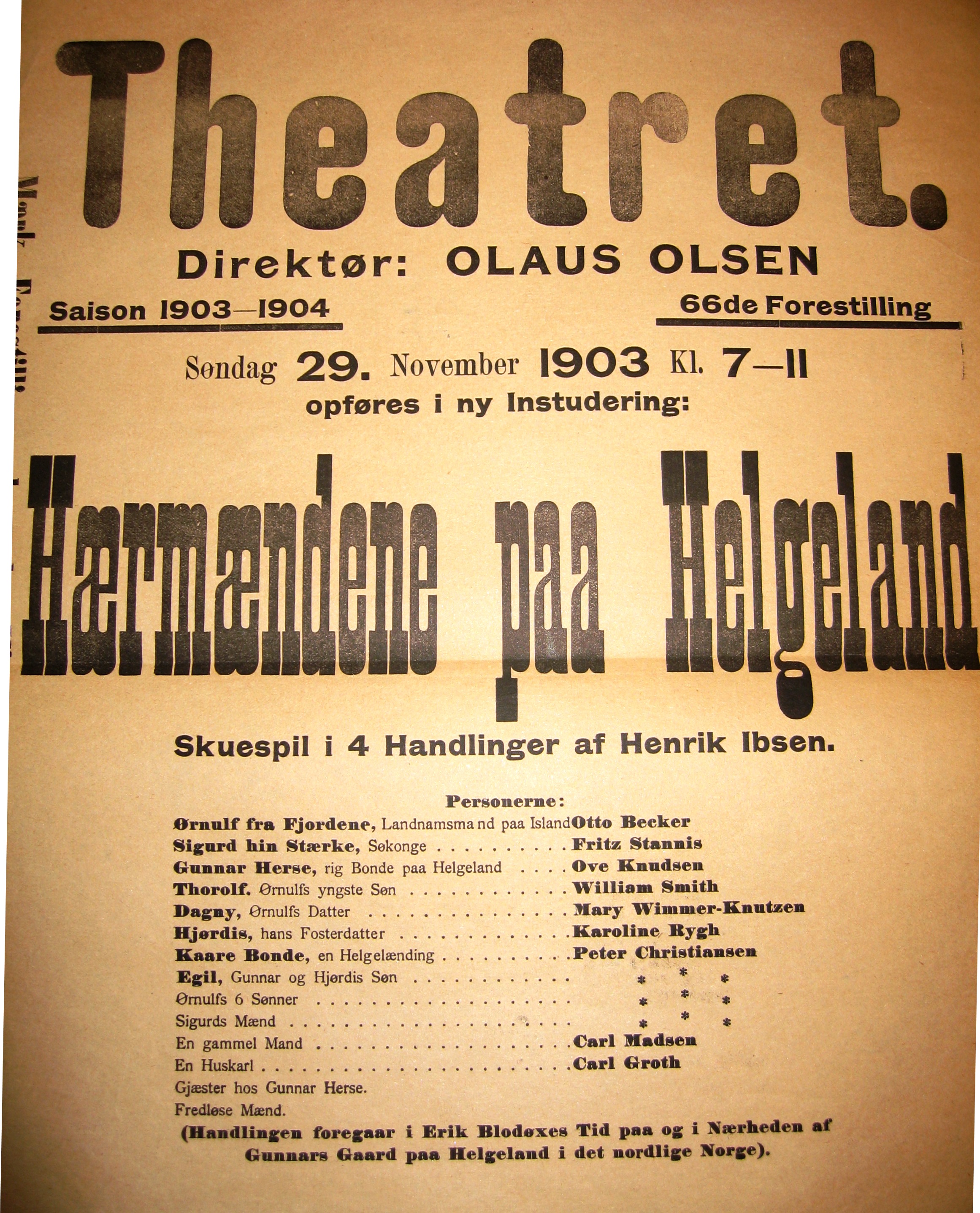 Plakat for Olaus Olsens Theaterselskabs produksjon Hærmendene paa Helgeland (1903)