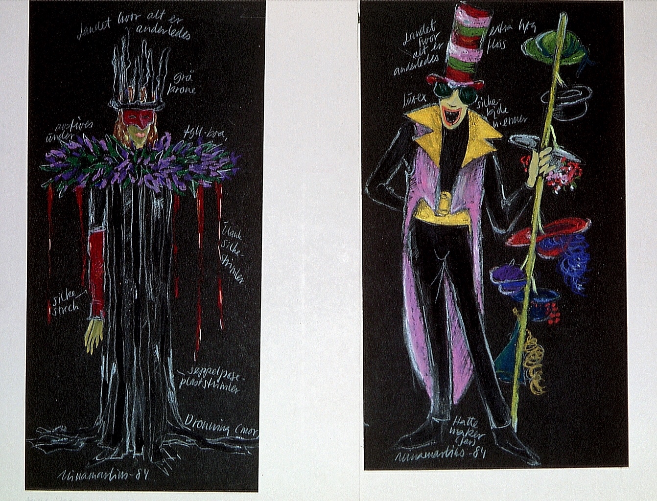 Kostymetegning fra Riksteatrets produksjon Landet der alt er annleis (1984)