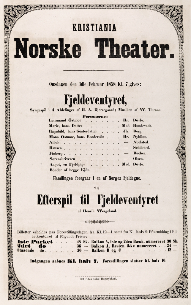 Plakat fra Kristiania Norske Theaters produksjon Fjeldeventyret (1858)