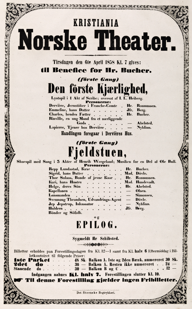 Plakat fra Kristiania Norske Theaters produksjon Den förste Kjærlighed og Fjeldstuen (1858)