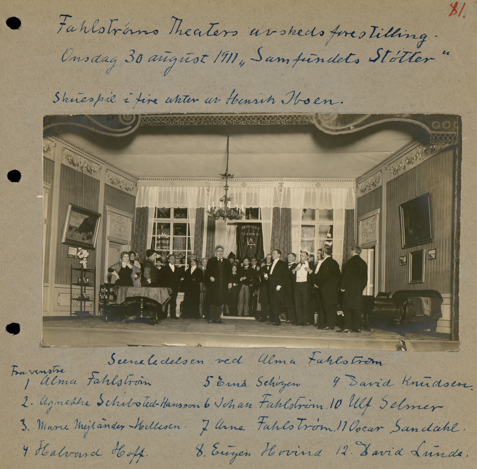 Fotografi fra Fahlstrøm Theaters produksjon Samfundets støtter (1911).