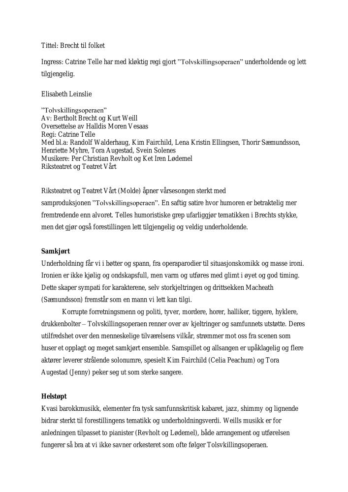 Brecht til folket (literally: Brecht for the people). Review of The Norwegian Touring Theatre and Teatret Vårt (Our Theatre)'s production The Threepenny Opera (2007). The review was published in Dagsavisen January 19 2007.