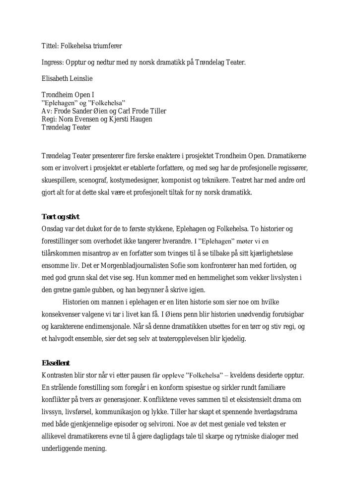 Anmeldelse av Elisabeth Leinslie i Dagsavisen av Trøndelag Teaters produksjon Trondheim Open 1 (2007)