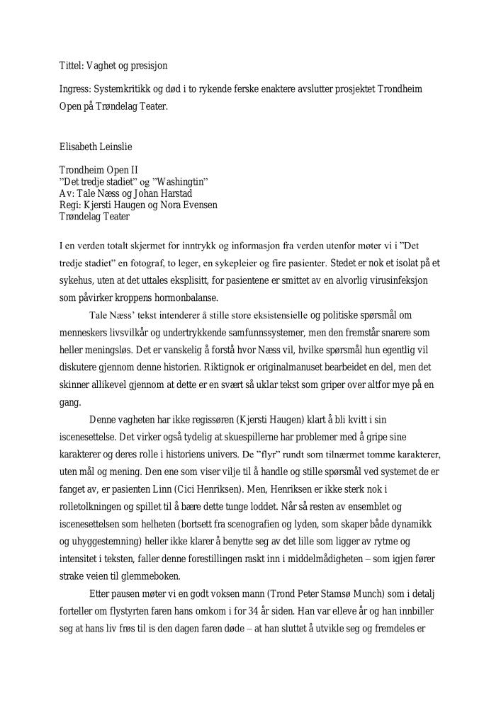 Anmeldelse av Elisabeth Leinslie i Dagsavisen av Trøndelag Teaters produksjon Trondheim Open 2 (2007)
