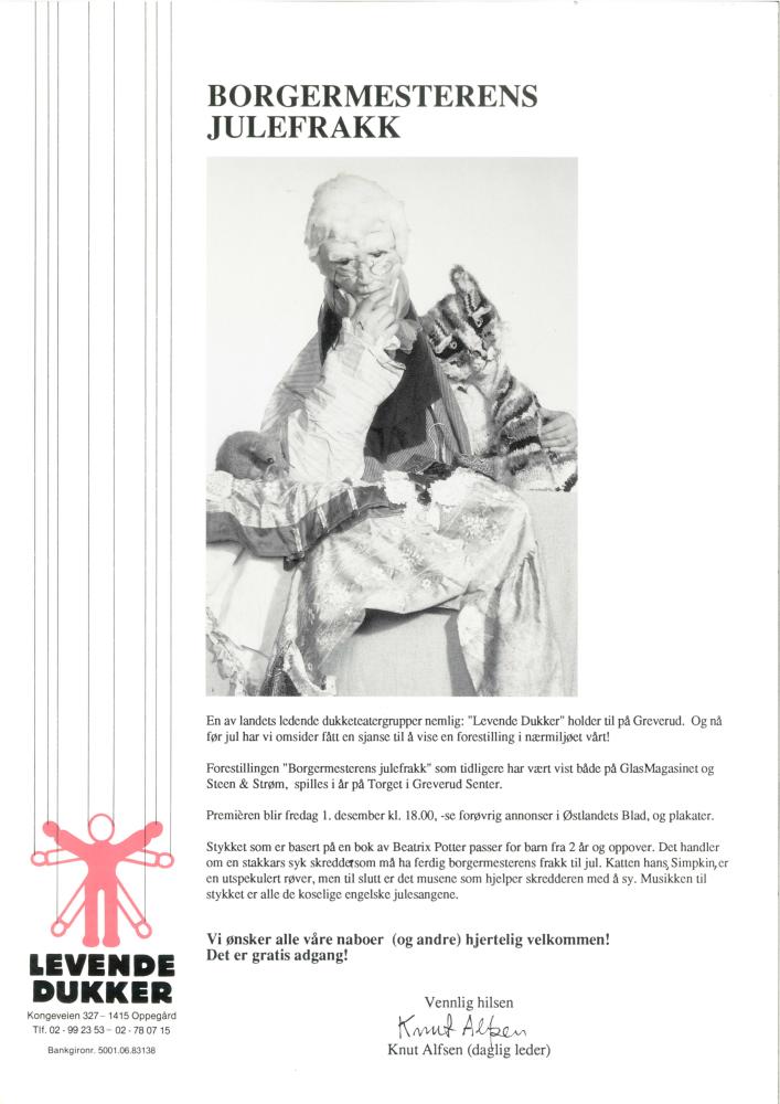 Flygeblad for Levende Dukkers produksjon Borgermesterens Julefrakk (1987).