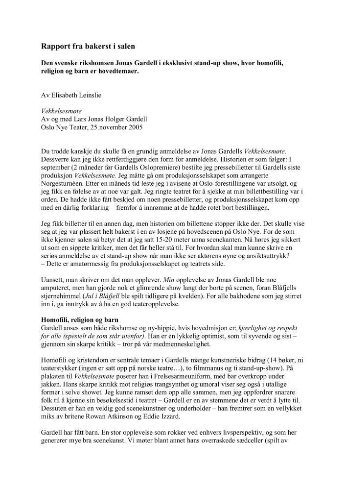 Anmeldelse av Elisabeth Leinslie i Norsk Shakespeare- og Teatertidsskrift av Jonas Gardells produksjon Vekkelsesmøte (2005)