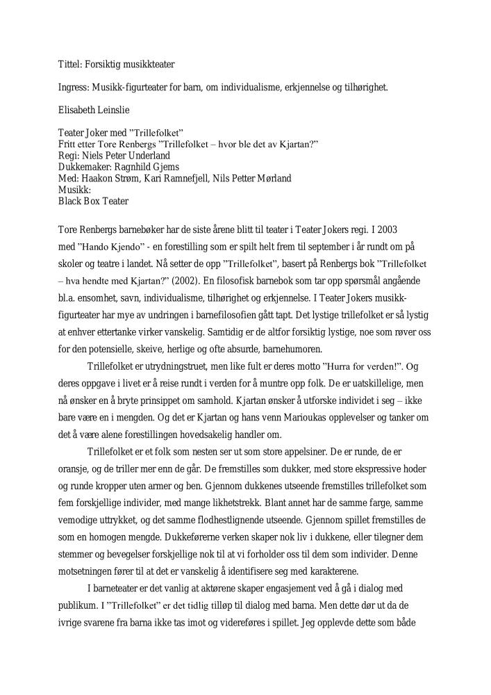 Anmeldelse av Elisabeth Leinslie i Dagsavisen av Teater Jokers produksjon Trillefolket (2006)