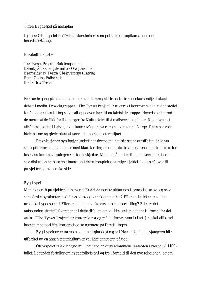 Anmeldelse av Elisabeth Leinslie i Dagsavisen av The Tynset Projects produksjon Bak lengste mil (2006)