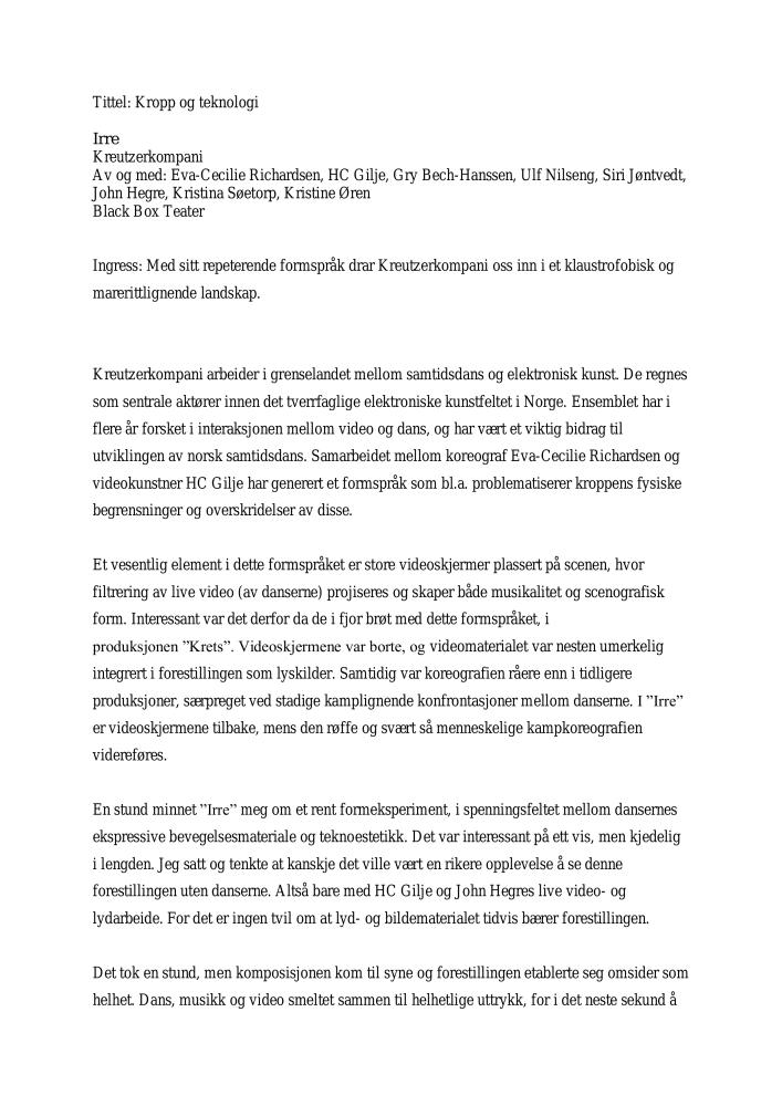 Anmeldelse av Elisabeth Leinslie i Dagsavisen av Kreutzerkompanis produksjon Irre (2006).