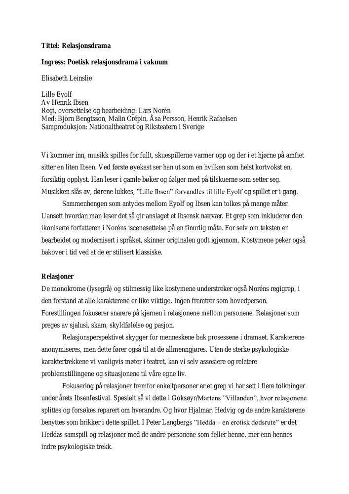 Anmeldelse av Elisabeth Leinslie i Dagsavisen av Nationaltheatret og Riksteaterns produksjon Lille Eyolf (2006)