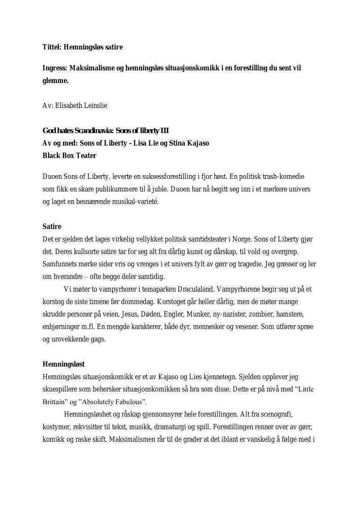 Anmeldelse av Elisabeth Leinslie i Dagsavisen av Sons of Libertys produksjon God Hates Scandinavia (2006)