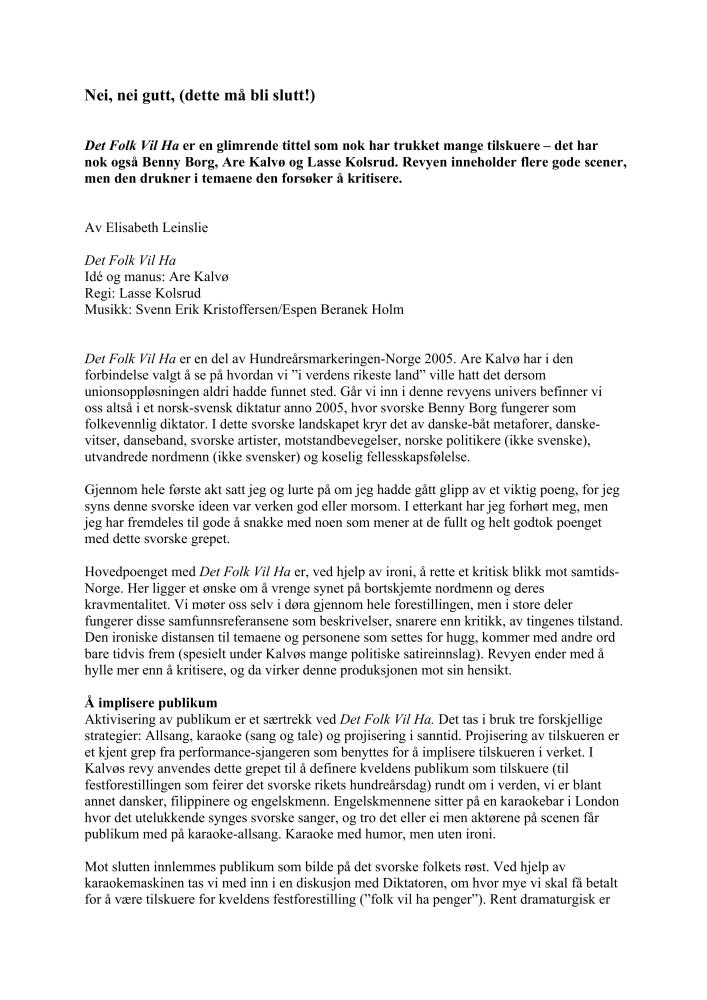 Anmeldelse av Elisabeth Leinslie i Norsk Shakespeare- og teatertidsskrift av Det Norske Teatrets produksjon Det Folk Vil Ha (2005)