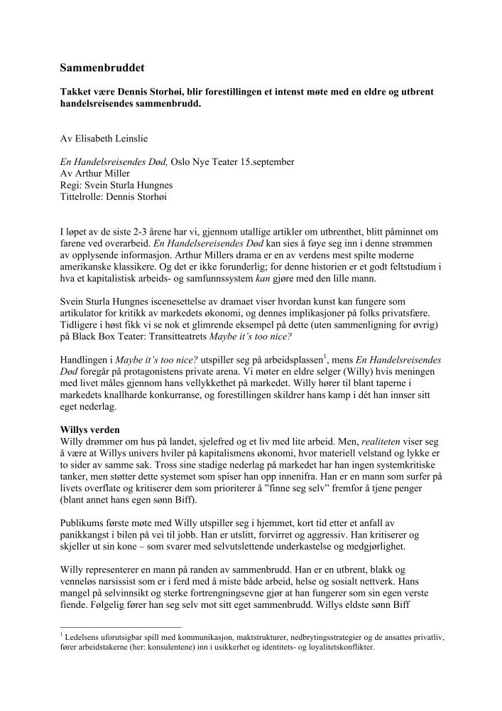 Sammenbruddet (literally: The breakdown). Review of Oslo Nye Teater (Oslo New Theatre)'s production Death of a Salesman (2005). The review was published by Norsk Shakespeare- og teatertidsskrift, issue no. 3-4 2005.