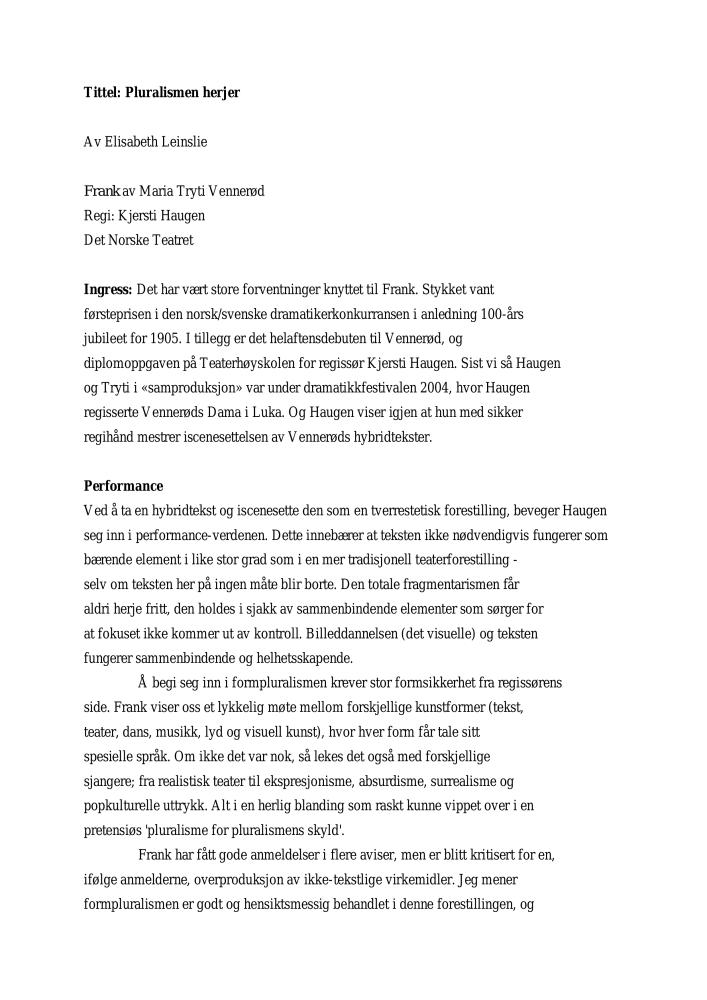 Anmeldelse av Elisabeth Leinslie i Morgenbladet av Det Norske Teatrets produksjon Frank (2005)