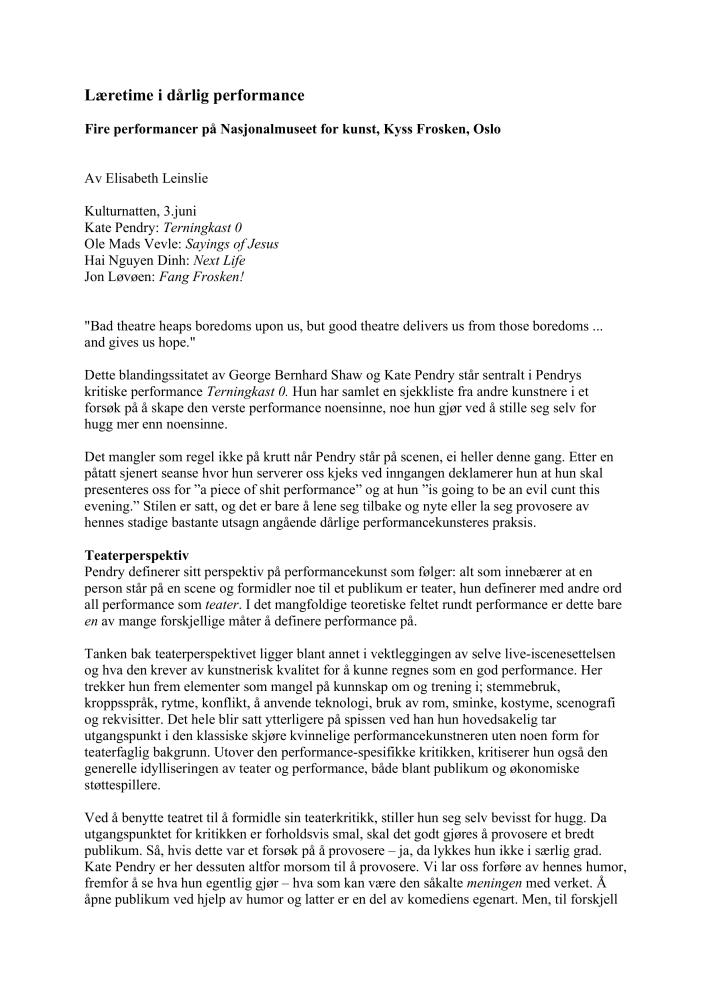 Anmeldelse av Elisabeth Leinslie i Norsk Shakespeare- og teatertidsskrift av 4 produksjoner under Kulturnatten (2005)