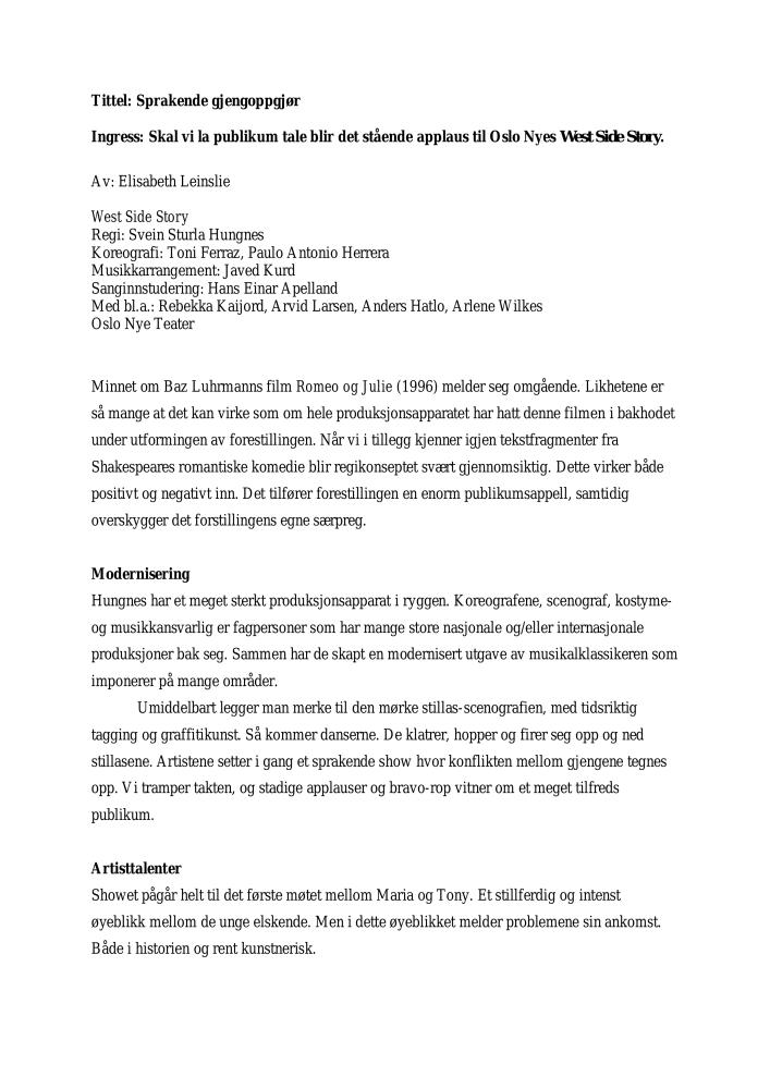 Anmeldelse av Elisabeth Leinslie i Dagsavisen av Oslo Nye Teaters produksjon West Side Story (2006)