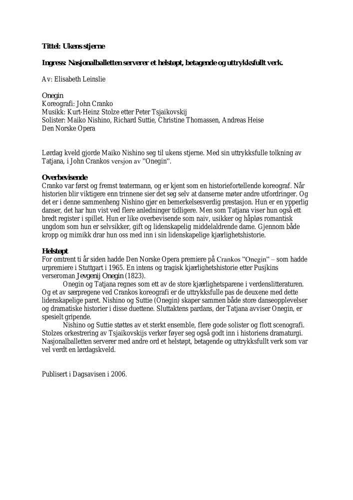 Anmeldelse av Elisabeth Leinslie i Dagsavisen av Den Norske Opera & Balletts produksjon Onegin (2006)