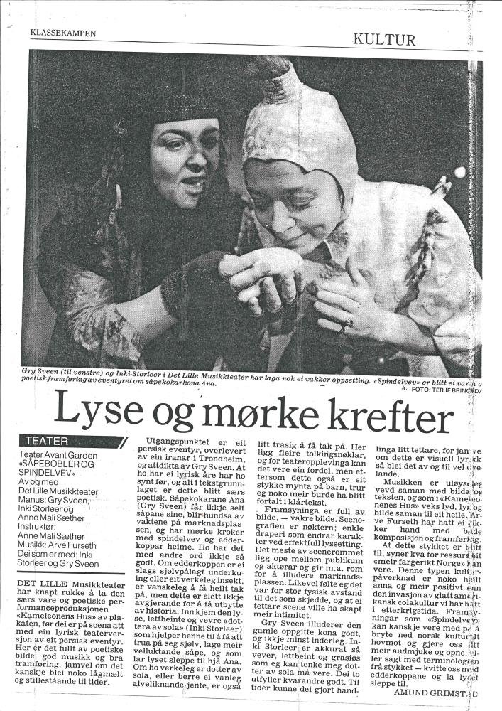 Anmeldelse av Amund Grimstad i Klassekampen av Magna Voxs produksjon Spindelvev (1988)