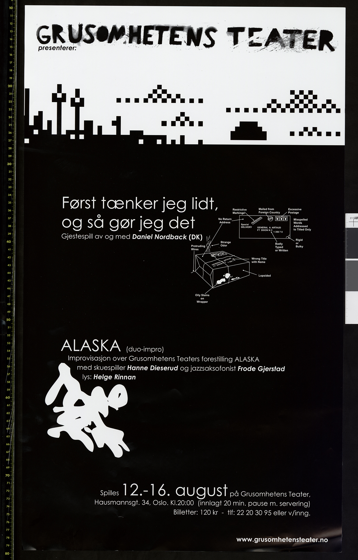 Poster for The Theatre of Cruelty's production Alaska (2001) and Daniel Nordback's performance Først tænker jeg lidt, og så gør jeg det* (First I think a little, then I do it) (2003). The poster is for performances at The Theatre of Cruelty in Hausmania, August 2003.